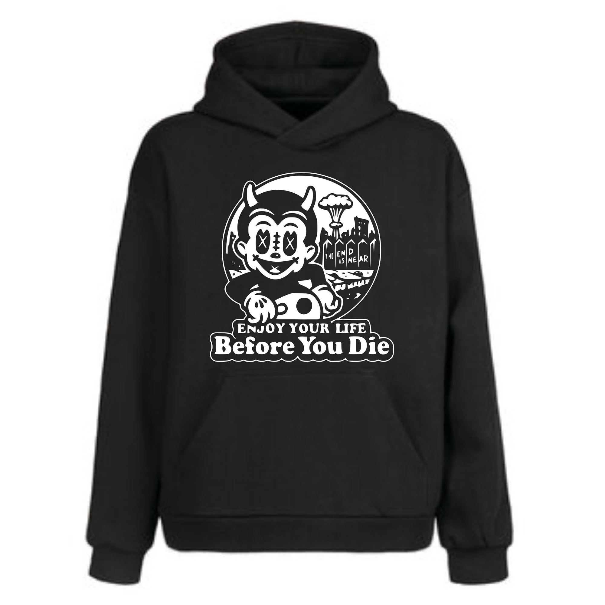 Before you die you should enjoy your life! On a premium heavyweight hoodie. Made of 80% cotton and 20% polyester. 400GSM sure to keep you toasty! Hit [email protected] to discuss color options! I love you! 🤙🏻🚀